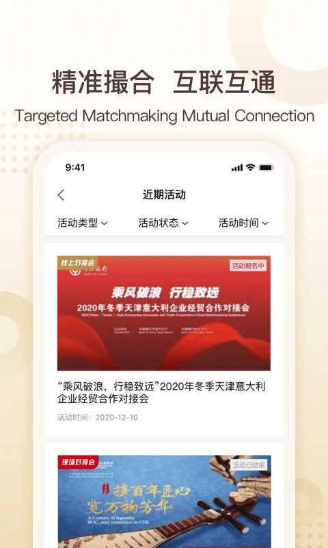 进入首页后点击"撮合活动"按钮,即可进入活动大厅浏览正在报名的各类商业活动。在活动详情页面点击"立即报名",按照指引填写完整的报名信息并提交。系统会实时反馈报名状态,并通过消息提醒告知审核结果。