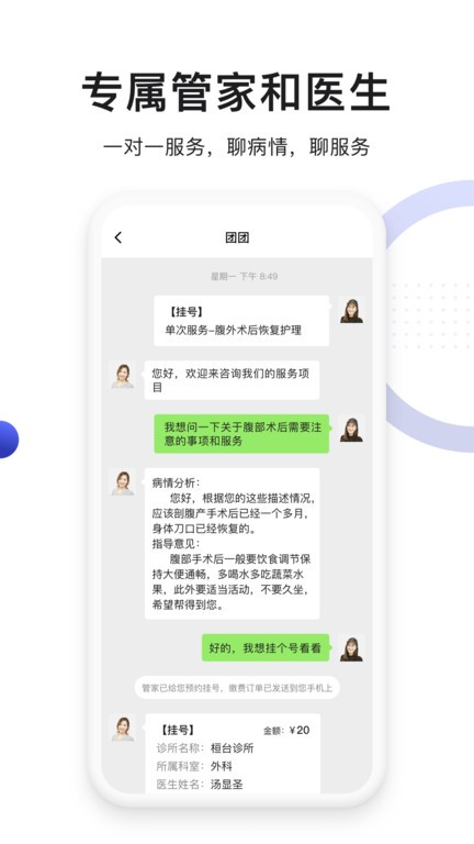 与专属医生或健康管家进行一对一图文聊天,方便咨询病情、恢复建议及服务内容,实现贴心健康管理。医生回复及时专业,为用户提供持续的健康跟踪服务。