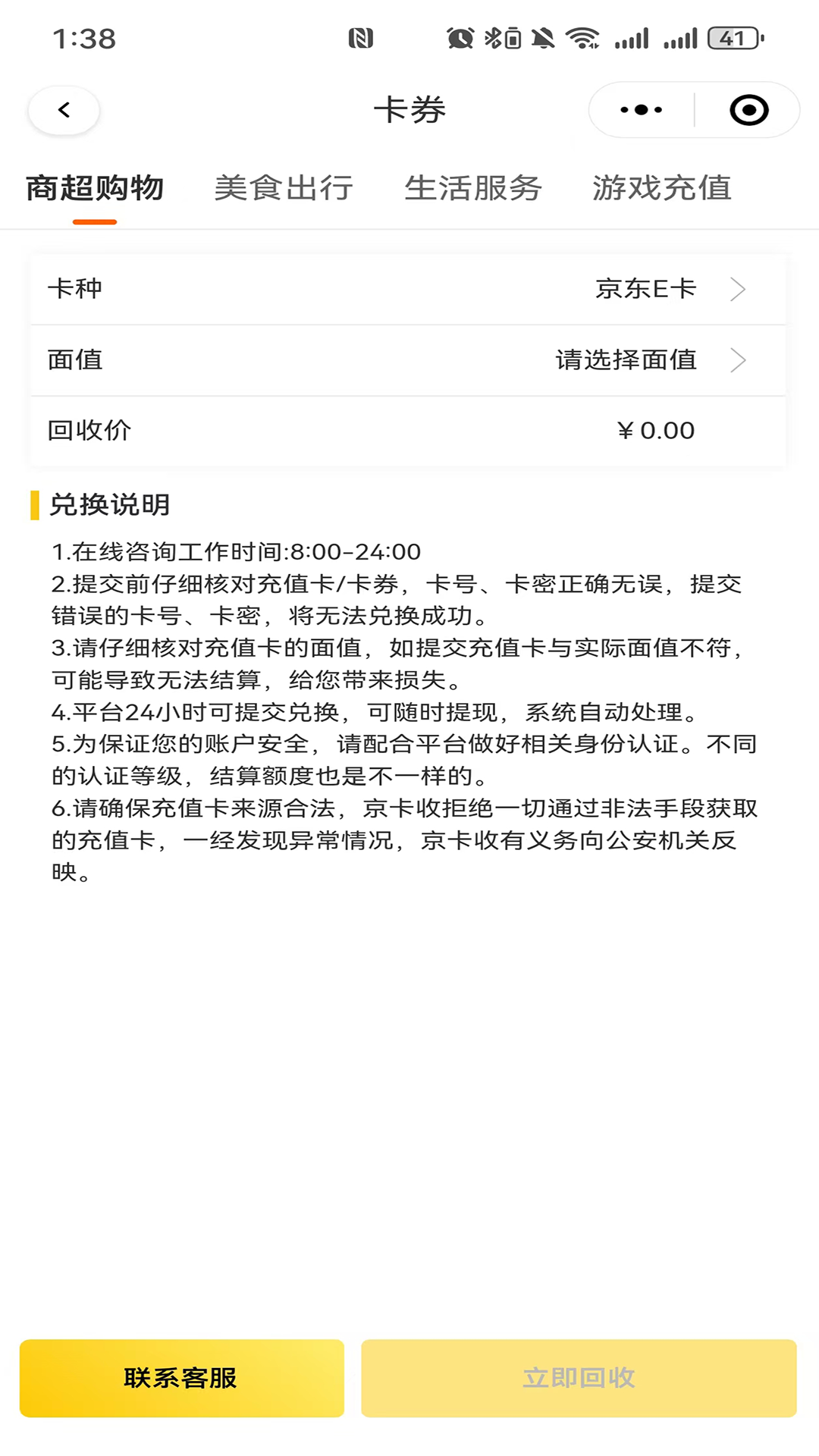 在线上购物领域,京卡收支持京东E卡礼品卡等主流电商平台卡券的回收服务;在日常消费场景中,用户可以通过京卡收回收沃尔玛超市购物卡、永辉超市卡、天猫超市卡、盒马先生礼品卡等常见商超卡券;对于有车一族,平台还提供中石化加油卡等出行类卡券的回收服务。这些丰富的业务类型确保了用户手中各类闲置卡券都能找到合适的回收渠道。