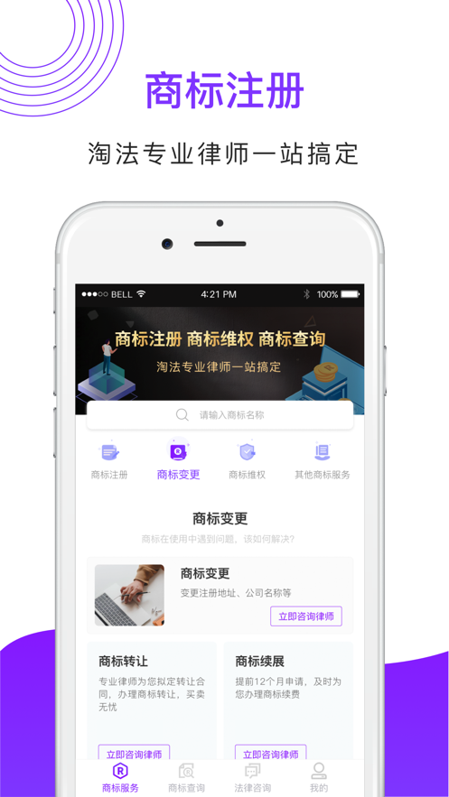 提供商标查询,商标注册,商标设计,商标申请服务,同时提供国际商标、商标维权、商标无效、商标驳回复审、商标异议、商标转让、商标买卖、商标续展、商标变更、商标撤销等业务在线咨询。在商标使用过程中遇到的各种侵权及维权问题均可以咨询我们的app在线顾问或者直接电话联系我们的专业人员。平台与全国300+律师事务所建立合作,可提供侵权监测、律师函发送、行政投诉、诉讼代理等深度法律服务,年处理商标纠纷案件超2000件。