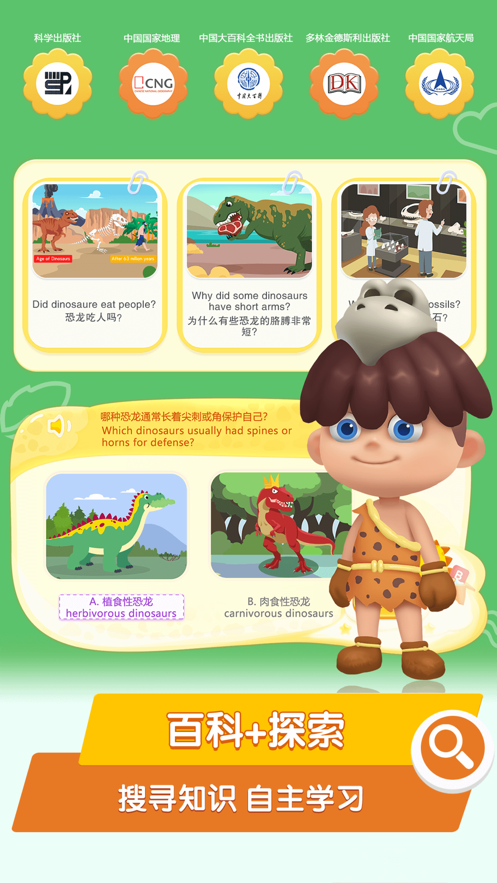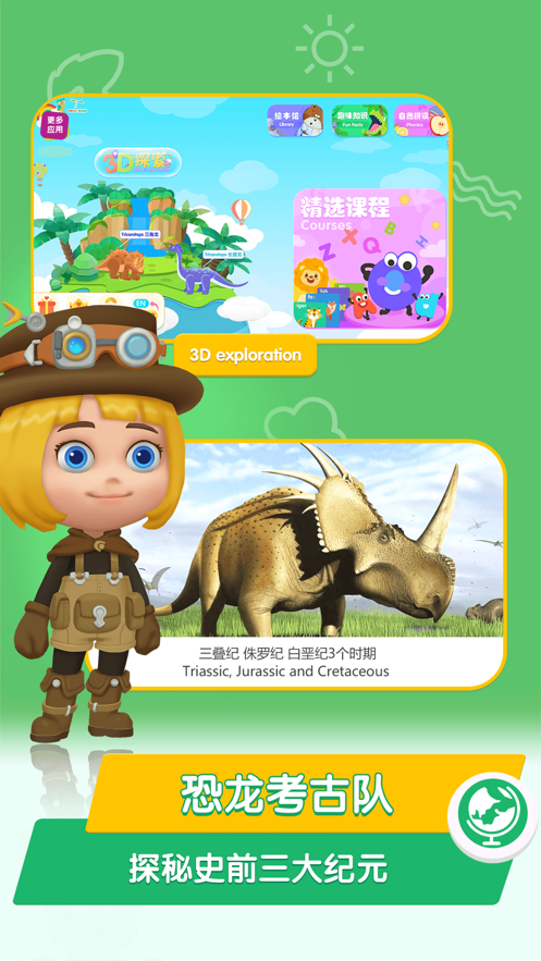 应用涵盖三叠纪、侏罗纪、白垩纪三个地质时期的恐龙知识,详细介绍40多种恐龙的形态特征和生活习性。170多个精选课程主题,配合原创视频和双语讲解,为孩子解答关于恐龙的十万个为什么。内容设计既注重科学性又兼顾趣味性,让孩子在轻松愉快的氛围中收获知识。
