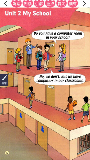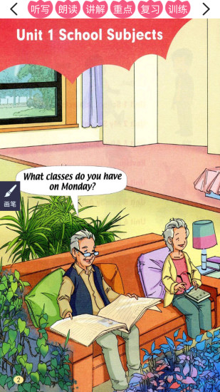讲解,进入单元的教学大纲,提示用户需要掌握的知识点及重点单词,配有动画演示;