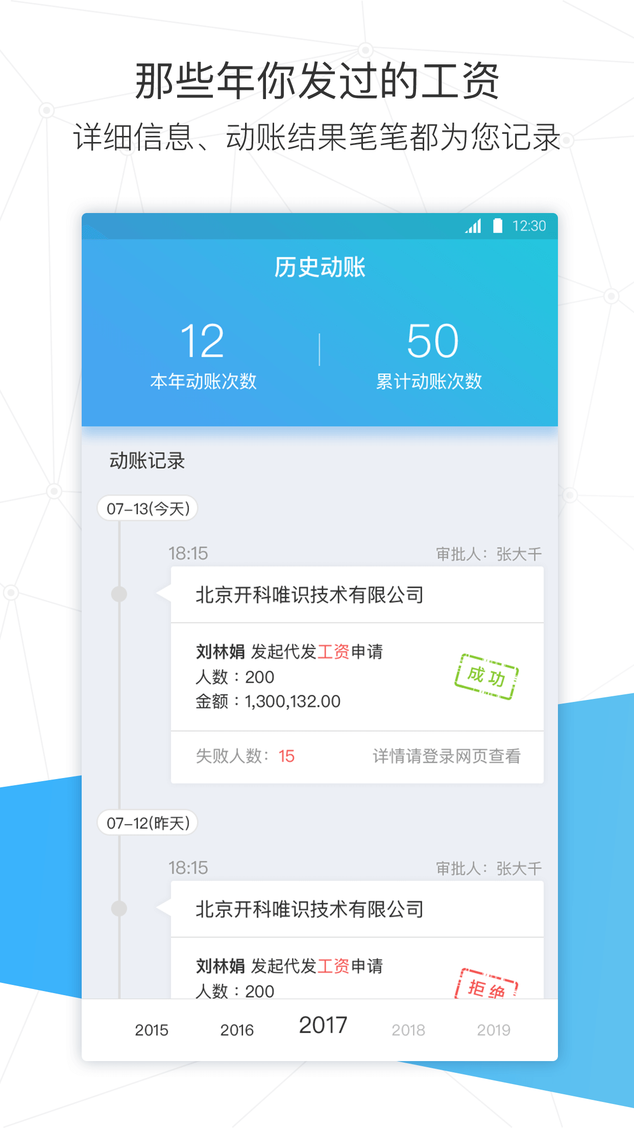 详细信息、动账结果笔笔都为您记录,可按月份、部门等多维度查询历史薪资数据,支持导出Excel报表;