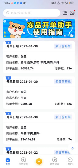 首先打开冻品开单助手软件,进入到首页中点击正下方的加号图标,系统会弹出新建订单的悬浮窗口。之后填写好信息之后点击下一步即可,软件会自动校验必填字段并高亮提示遗漏项,确认无误后支持一键生成带有红色标识的特价订单,方便财务人员快速识别促销单据。
