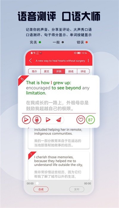 通过英语演讲吧,用户可以深入了解各个领域的知识,这不仅有助于提升英语水平,还能拓展文化视野。平台特别注重口语训练,通过多种互动方式帮助不同水平的用户提高英语口语技能,甚至可以在虚拟环境中模拟演讲场景进行练习。用户还可以通过对比不同地区的英语口语风格,学习更地道的表达方式和发音技巧。平台还提供专业的口语评测功能,帮助用户精准定位发音问题,并提供改进建议,让英语学习更加高效。