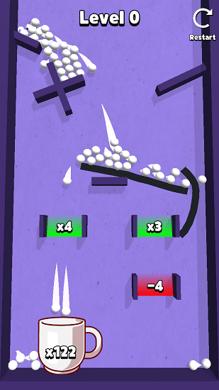 游戏的核心玩法非常独特:玩家需要根据关卡中障碍物和乘数门的位置,最多可以绘制两条引导线。当小球开始弹跳时,你需要利用这些挡板来改变小球的运动轨迹。游戏允许在屏幕任意位置绘制引导线,左上角是小球下落的初始位置。这种创新的玩法设计既考验玩家的空间想象力,又需要精准的操作技巧,让游戏过程充满趣味性和挑战性。随着游戏深入,关卡设计会越来越巧妙,需要玩家不断尝试新的策略才能过关。