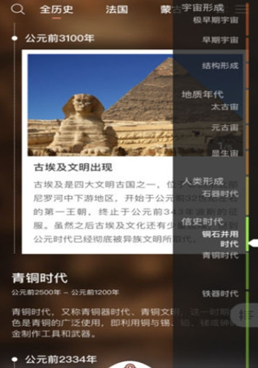 讲述影响了世界历史进程的大事件,包括世界各个国家发生的大事件。从古埃及文明到文艺复兴,从工业革命到信息时代,完整呈现人类文明发展脉络。特别设置了比较历史功能,可以同时查看同一时期中国和世界其他地区的历史发展情况。