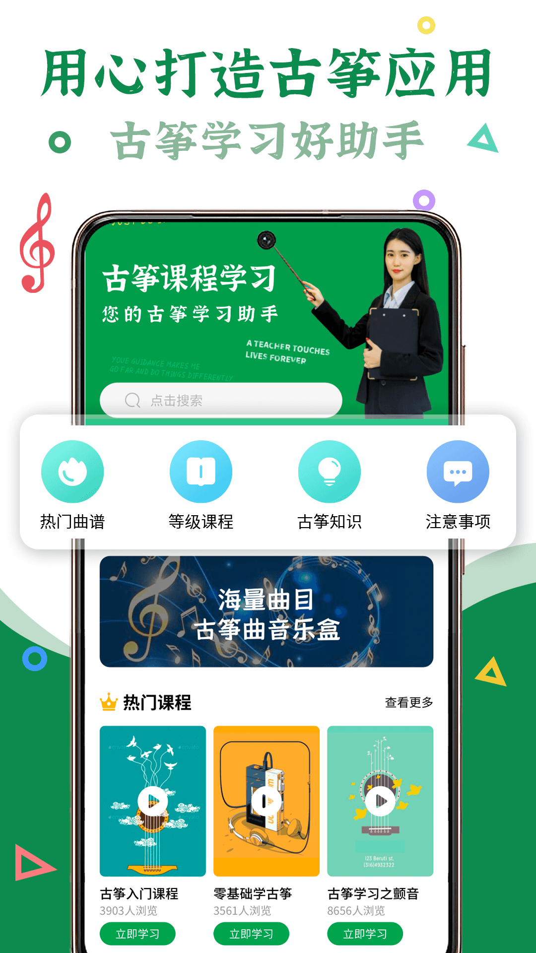 手机古筝app下载,这是一款专为古筝爱好者精心打造的在线学习与陪练助手。无论您是零基础初学者还是有一定基础的演奏者,都能在这里找到适合自己的学习内容。手机古筝app汇集了海量优质古筝课程,让您随时随地随心学习,专业陪练功能助您快速掌握更多演奏技巧。丰富的互动体验让学习过程充满乐趣,感兴趣的朋友快来下载体验吧!