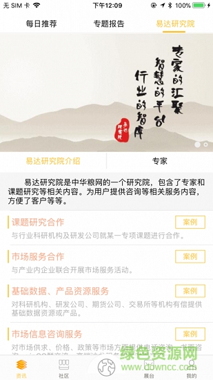 资讯版块二级页面有:每日推荐、专题报告、易达研究院;每日推荐给用户推荐行业相关文章、新闻资讯、相关活动展示,并可在线支付活动参与费用,支持活动提醒功能。专题报告展示专家撰写的定制化电子报告,涵盖市场分析、技术指导等内容。易达研究院具备专家展示,案例展示,专家在线聊天咨询,以及查看专家文章等功能,支持预约专家一对一服务。社区版块二级页面有:活动、圆桌、人脉、动态;活动为用户所发起的各种洽谈、考察、参观、交流等活动,支持在线报名和签到;圆桌为临时会话组,方便多人即时讨论特定话题。