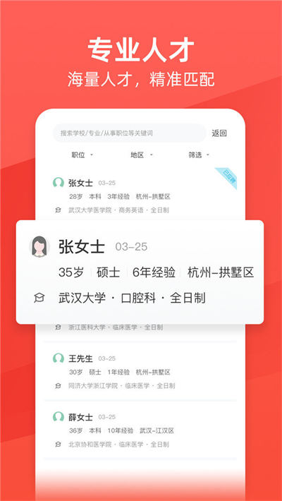 提供多维度筛选功能,可按地区、薪资范围、医院等级、科室类别等20余项条件进行精准筛选,满足不同层次医疗人才的多样化求职需求。