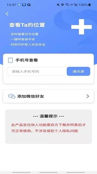 使用极速寻人前,请确保已开启手机的位置定位权限,否则软件无法正常提供定位服务。同时,定位功能需要双方均安装本软件,并获得对方的明确授权同意,以确保隐私权益不受侵犯。本软件仅限用于家庭亲友之间的安全守护,严禁用于其他非法或不道德用途。