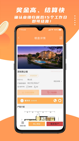在线预订:提供便捷的在线预订功能,帮助购房者快速锁定心仪房源。您只需动动手指,就能为客户创造价值,同时获得可观收益。