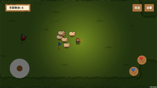 通过屏幕上显示出来的玩法模式:【蓝色旗】集合羊群,放置【红色旗】伙伴集合伙伴,可在野怪附近集合伙伴,伙伴会攻击附近的野怪。玩家需要根据地形特点合理布置旗帜位置,比如在狭窄通道设置防御点,或是在开阔地带分散羊群降低风险。游戏还设有天气系统,不同天气会影响狼群的活动规律,需要玩家随机应变调整策略。