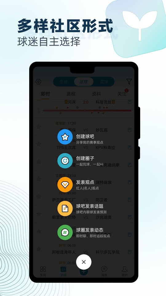 点击底部"+"可以发表自己的观点,包括创建球吧、创建圈子、发表话题观点等。