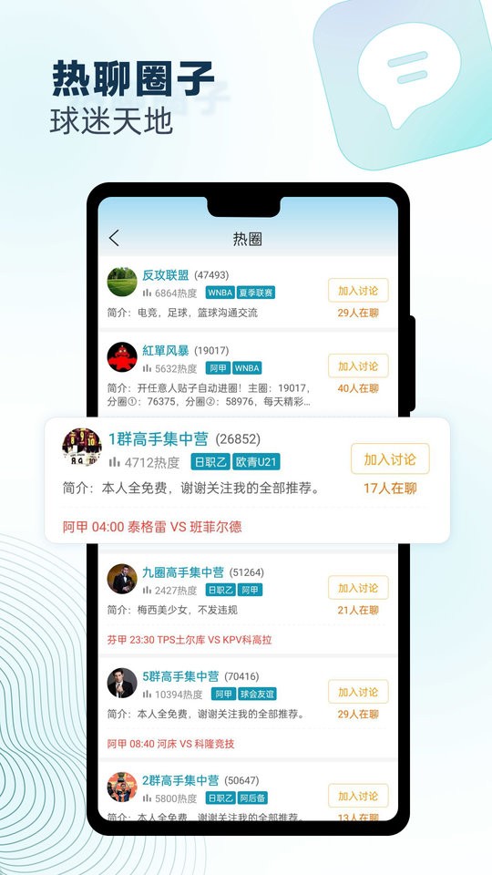 球友聊天,自行创建或加入兴趣群组,畅谈足球篮球探比赛事;