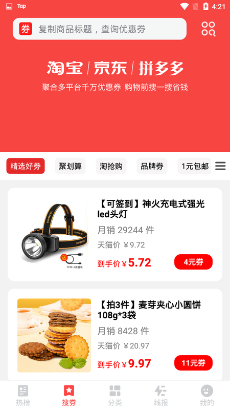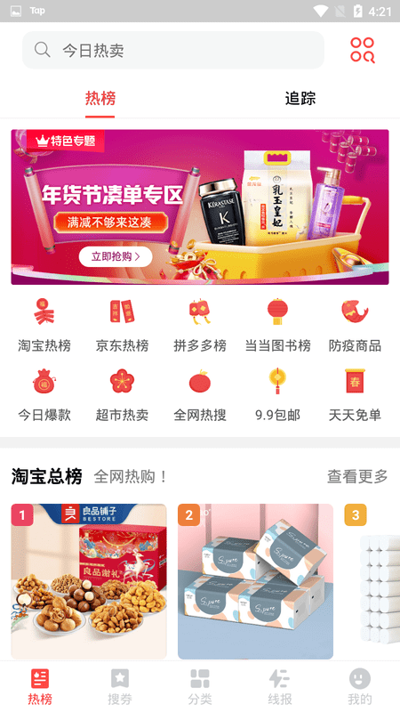 今日热卖是一款专为网购达人打造的优惠券聚合平台,让你轻松享受全网超值购物体验。在这里,你可以一键获取淘宝、京东、拼多多等各大电商平台的隐藏优惠券,涵盖服饰、数码、家居、美妆等全品类商品。平台每日精选上万款爆款商品,提供至高90%的折扣力度,更有9.9元包邮专区让你享受极致性价比。通过智能比价系统,今日热卖能帮你实时追踪商品价格波动,确保不错过任何优惠时机。