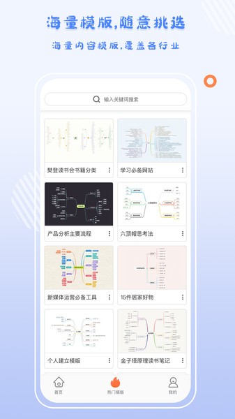 GitMind拥有行业领先的素材库,包含22种专业思维导图样式、70多个精心设计的模板以及海量流程图元件。用户无需设计基础,就能轻松制作出专业水准的思维导图、组织结构图、流程图、UML图以及网络拓扑图等十多种实用图形,满足各种场景需求。