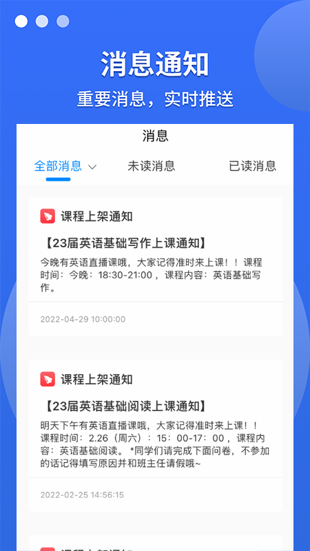 消息推送:聚创考研在线app的智能消息系统确保师生沟通无障碍。系统会及时推送教师回复、新课上架通知、资料更新提醒、答疑解惑以及班主任通知等重要信息。用户可以根据需要自定义消息接收设置,确保不错过任何关键学习资讯,让备考过程更加高效有序。