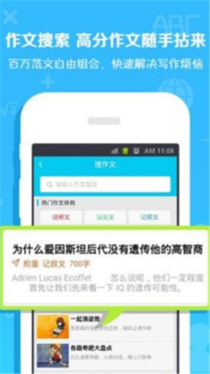 提供丰富的作文素材库,包含各年级优秀范文和写作技巧。支持按主题、体裁筛选,帮助学生积累写作素材,提升语言表达能力。