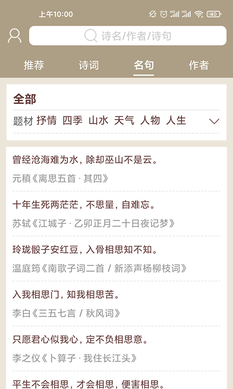 "诗词大全-古诗词大全"专为古典诗词爱好者、高中小学生提供鉴赏、阅读与学习的手机应用,收录了超过10万首经典作品,涵盖各个历史时期和流派。界面简洁易用,支持多种检索方式,让查找诗词变得轻松便捷,是随身携带的诗词图书馆。