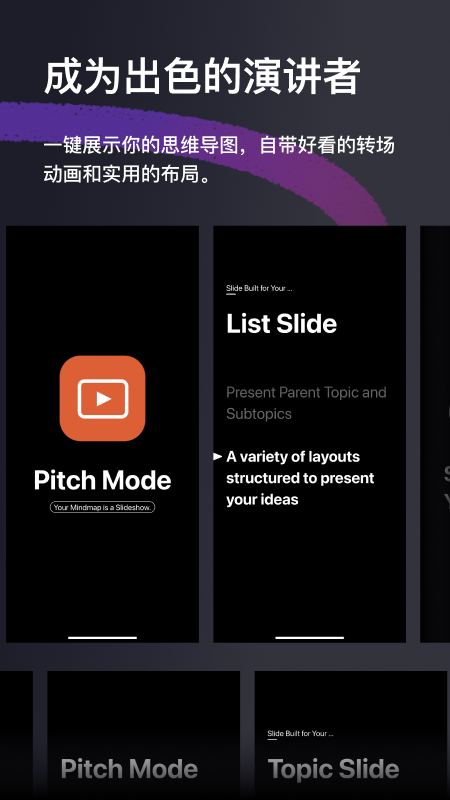 演说模式:一键即可以用幻灯片的方式展示你的思维导图,自动生成转场动画和布局,开启演说新体验。这个功能让演示更加生动,提升沟通效率。