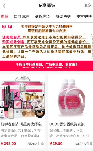 千娇亿华app是一款专注于美妆护肤领域的垂直电商平台,致力于为用户提供高性价比的购物体验。平台精选上千个国内外知名品牌,涵盖护肤、彩妆、个护等全品类商品,通过厂家直供模式确保正品低价。创新的社交拼团模式让用户能以市场价3-7折的价格购买心仪商品,同时完善的创客体系让每个爱分享的用户都能轻松赚取额外收入。