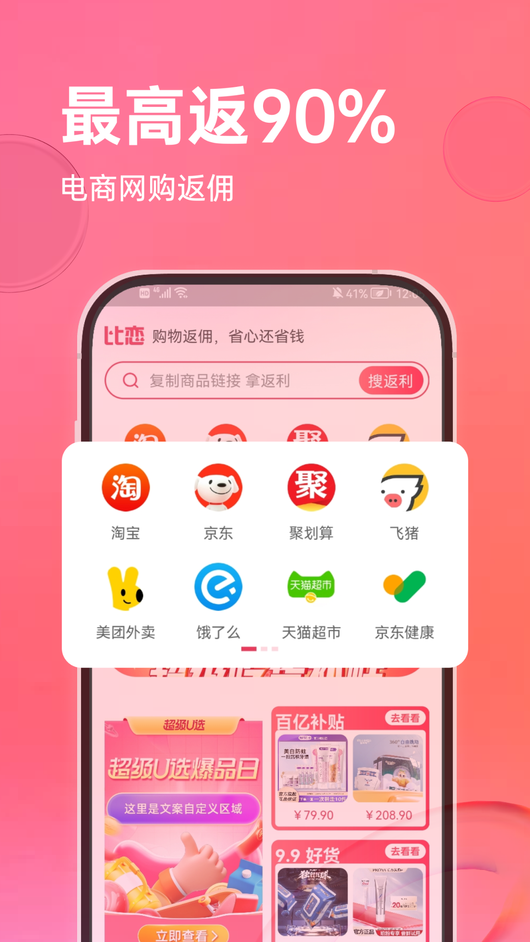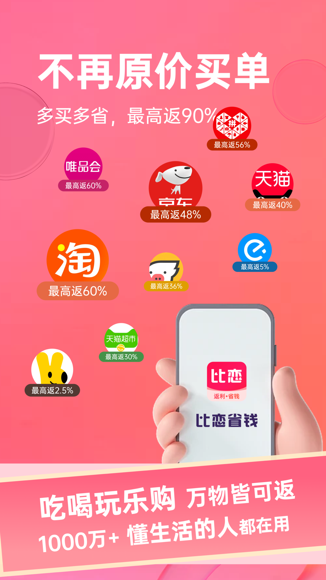 通过比恋合作伙伴,包括淘宝、京东、拼多多、唯品会、考拉海购等主流购物APP,可以获得超高比例的现金返现。返现比例远高于其他同类平台,购物越多省得越多。所有返现均可提现,让您的每一笔消费都能获得额外回报。