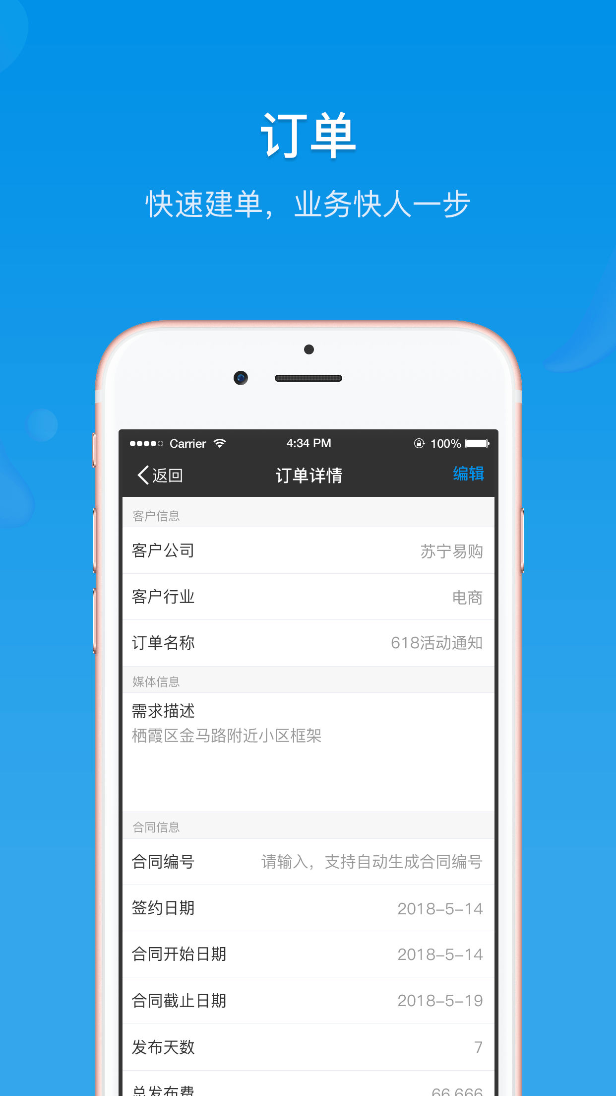主要功能包括上刊反馈,媒体管理,订单管理,审批流程,客户管理。