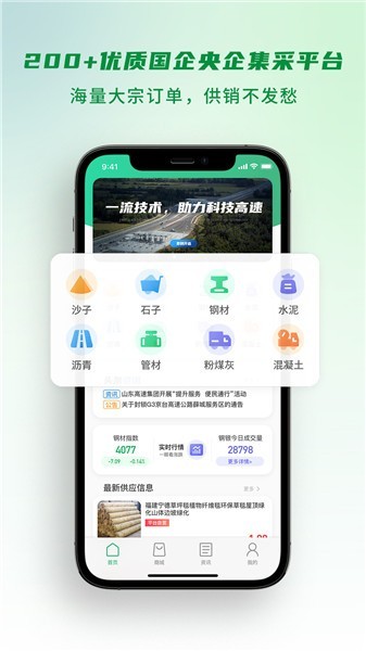 山高材料平台是山东高速材料数字科技有限公司倾力打造的大宗材料交易数字化平台。作为行业领先的B2B交易平台,它通过智能算法实现供需双方的精准匹配,为建筑钢材、水泥、混凝土等大宗商品交易提供全流程数字化服务。平台整合了超过10万家优质供应商资源,支持在线询价、电子签约、大额支付等核心功能,日均交易额突破亿元。依托山东高速集团的产业背景,平台不仅提供交易撮合服务,还配套物流运输、设备租赁等增值服务,真正实现大宗贸易的一站式解决方案。