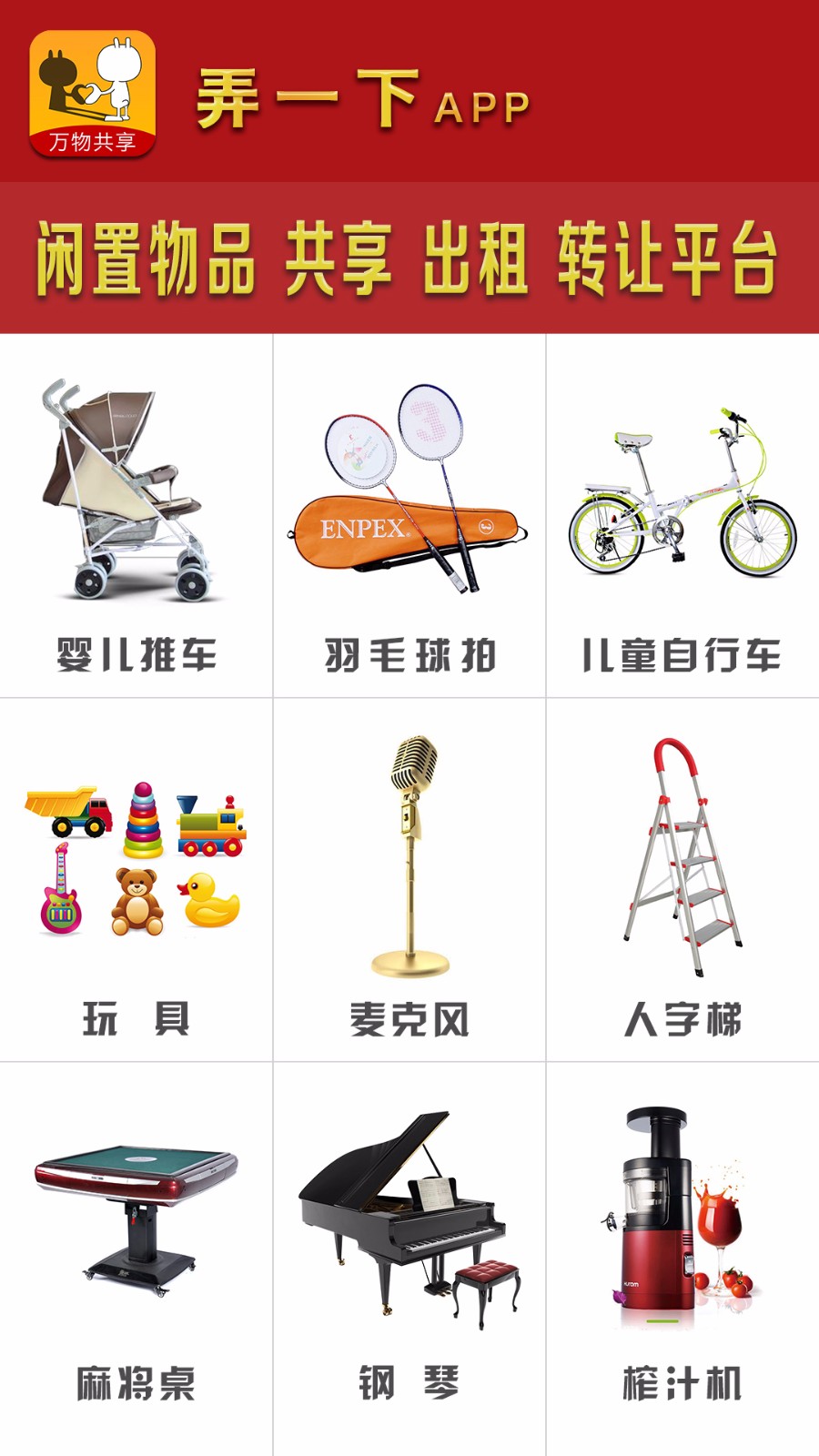 欢迎体验全新的生活共享服务平台《弄一下》!在这里,你不仅能享受便捷的物品共享服务,还能通过展示个人技能与爱好赚取额外收入。立即下载,开启你的共享经济新体验!