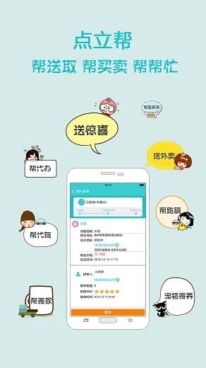 送取快件、外卖、鲜花礼物、陪护照料、跑腿代办,接送老人孩子、宠物寄养、顺路拼车、聊天交友、代喝酒应酬、找代驾、代陪练、帮捎带、帮拉货、帮搬家、帮侦探、帮打架...What?WC忘带手纸也能帮!!!在点立帮只有你想不到,没有我们帮不到;只要有需求,就会有帮助;