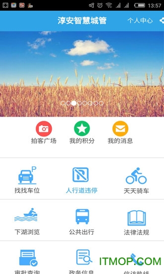 包含了个人中心、分享、拍客广场、我的积分、我的消息、找找车位、人行道违停、天天骑车、下湖浏览、公共出行、法律法规、审批查询、政务信息等功能