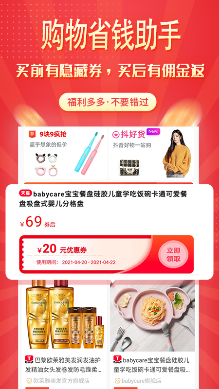 筛选、天猫、京东、、唯品会、苏宁、网易考拉等全网电商平台,一站式整合海量隐藏优惠券,千万人都在用的网购省钱利器;