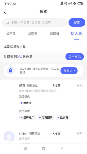 搜索功能支持关键词查询,可快速获取商机、商家、人脉、商品及市场等数据;智能商机推荐系统根据用户需求精准推送相关商业信息;平台还设有创新的推荐返利机制;提供商品集中采购服务;打造专业的会展展示空间;设立国际新品发布专区;同时支持批发市场商品销售及商铺全景展示功能。