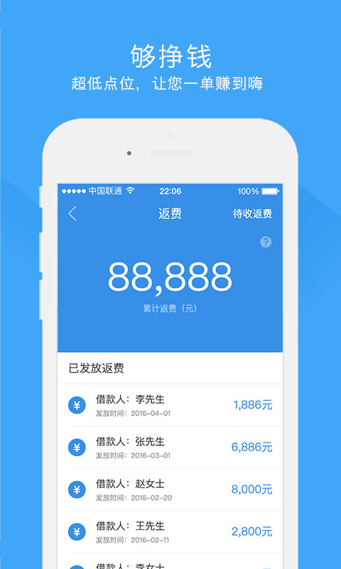 【返费管理】:做单返费到账,轻松查询返费记录。