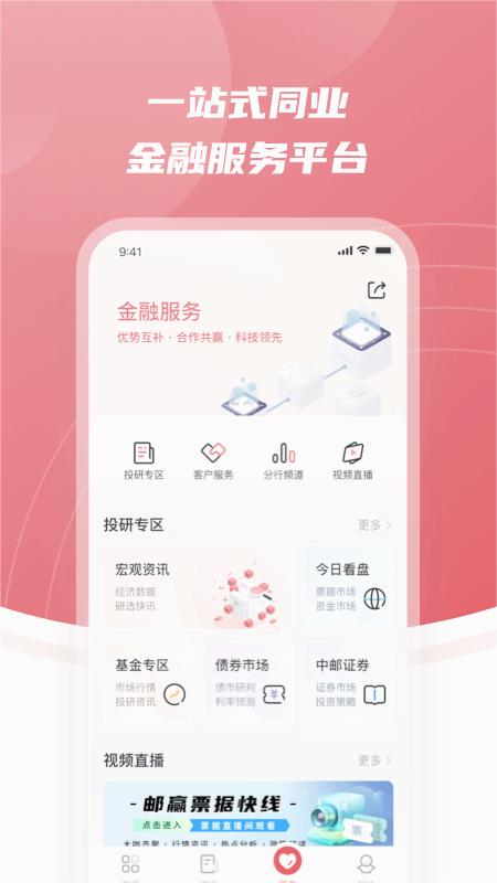 作为邮储银行推出的同业生态平台移动端,"邮你同赢"APP整合了客户交流、产品交易和信息共享三大核心功能,全面提升同业客户线上服务体验。该平台将持续优化创新,深化技术与业务融合,致力于为同业伙伴打造"同行、同进、同赢"的优质服务生态。