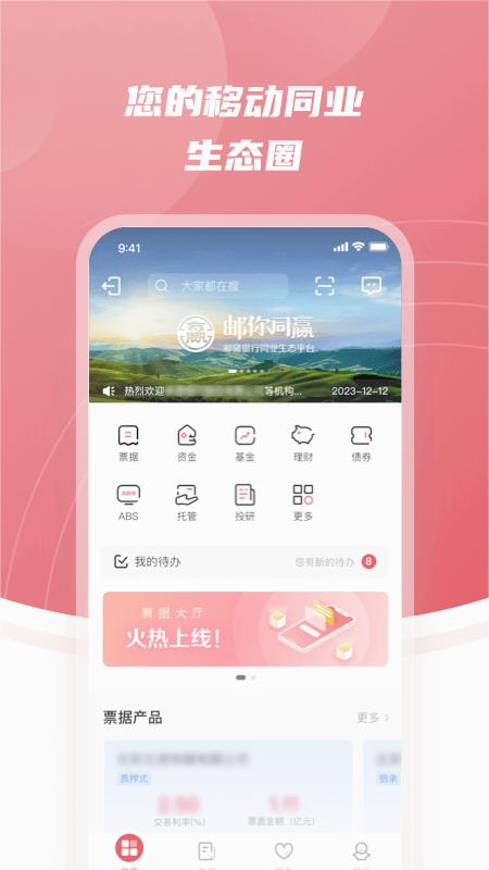 邮你同赢同业生态平台APP是专为同业客户打造的综合性金融服务平台,通过移动端为客户提供高效便捷的业务办理体验,实现产品推荐、在线交易和信息交互的一站式服务。