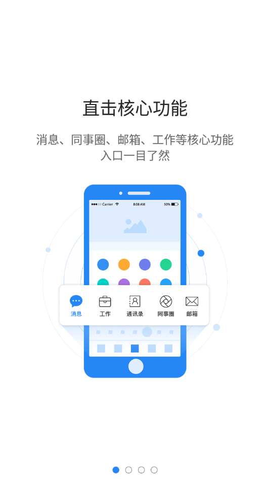 消息、同事圈、邮箱、工作等核心功能入口一目了然
