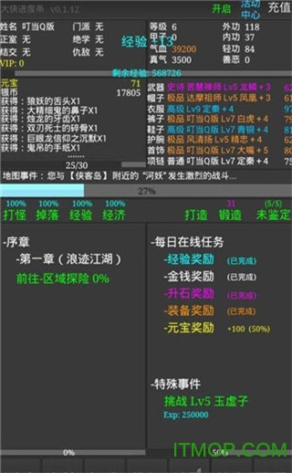 大侠进度条1.22内购破解版是一款充满江湖气息的放置类武侠游戏,其精美的画面设计令人眼前一亮。玩家可自由选择心仪的门派角色,体验酣畅淋漓的武林对决,快来IT猫扑开启你的武侠之旅吧!