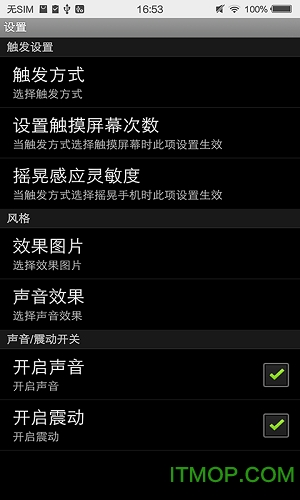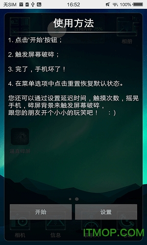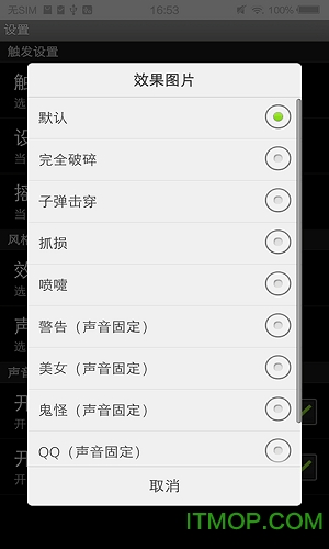 可设置触发方式,可设置为程序启动时或者手机摇晃时或者触摸屏幕时出现屏幕破碎等搞怪的效果