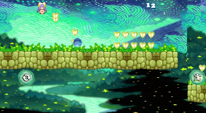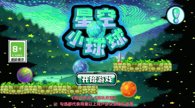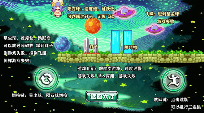 操控一个小球球跳跃在各种星星之间,星星并避开障碍物。