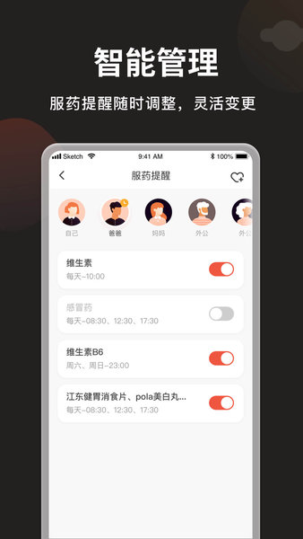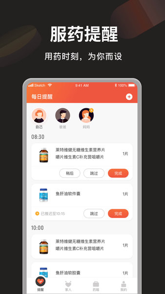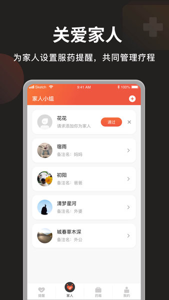 家庭共享功能让您能为家人创建服药计划,实时同步服药进度;