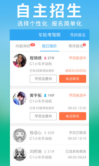 自主招生:学员年龄、照片、所在位置、对教练期望,您都能看到。选择适合自己的学员报价,工作效率翻一翻。