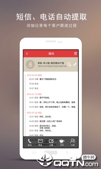 客户往来记录:通过时间轴直观呈现通话记录、短信往来和跟进笔记,确保重要信息一目了然;