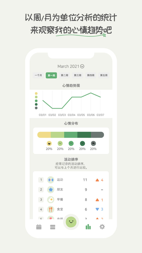 个性化活动标记:使用精美图标标注日常活动,通过月度或年度图表获取情绪与活动的趣味数据。