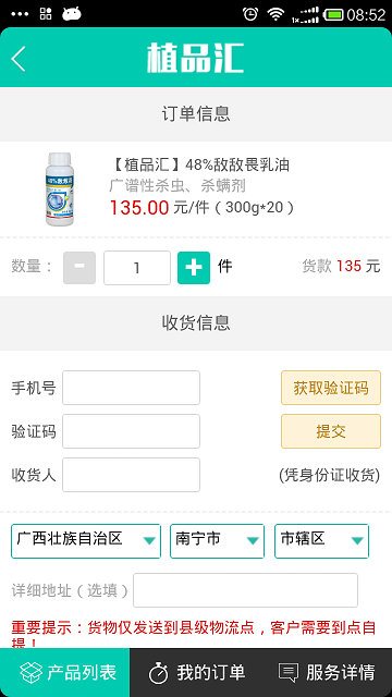 “植品汇”应用是北京植品汇农业科技有限公司开发的电子交易平台,经营产品为农药、肥料。功能包含产品展示、在线下单、在线支付(建设中)、订单状态追踪等。应用中的商品由北京植品汇农业科技有限公司拥有经销权,生产许可齐全,品质保证。
