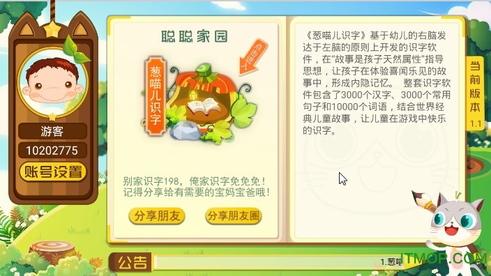葱喵儿识字,永久免费的识字软件!为3至10岁儿童设计,整套软件包含3000个汉字,10000个词语,包含小学一至六年级的同步识字课程,为3至10岁儿童设计,整套软件包含3000个汉字,10000个词语,包含小学一至六年级的同步识字课程。
