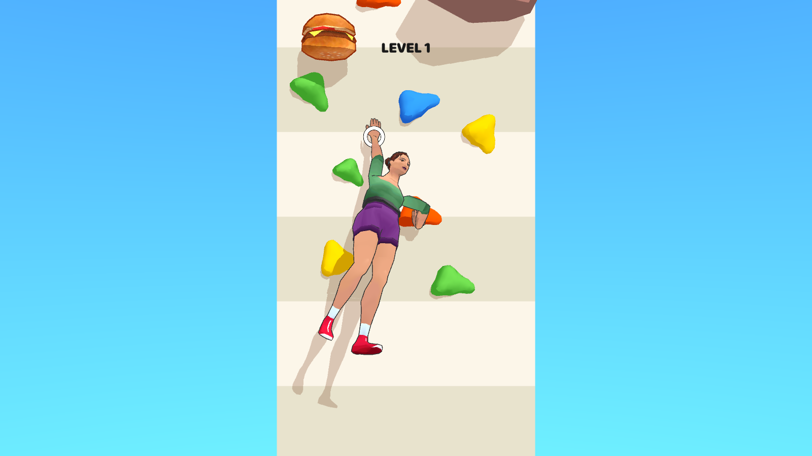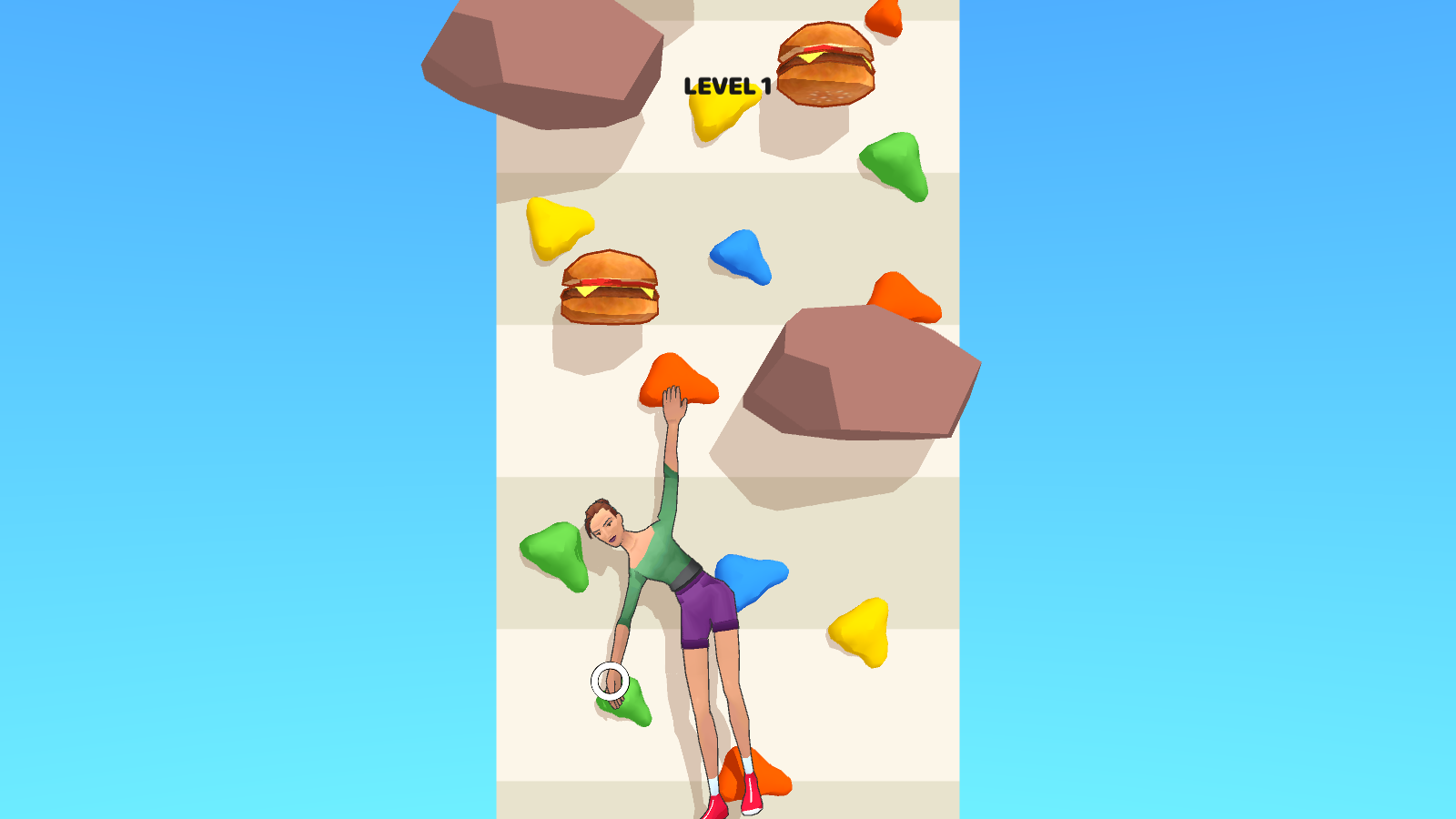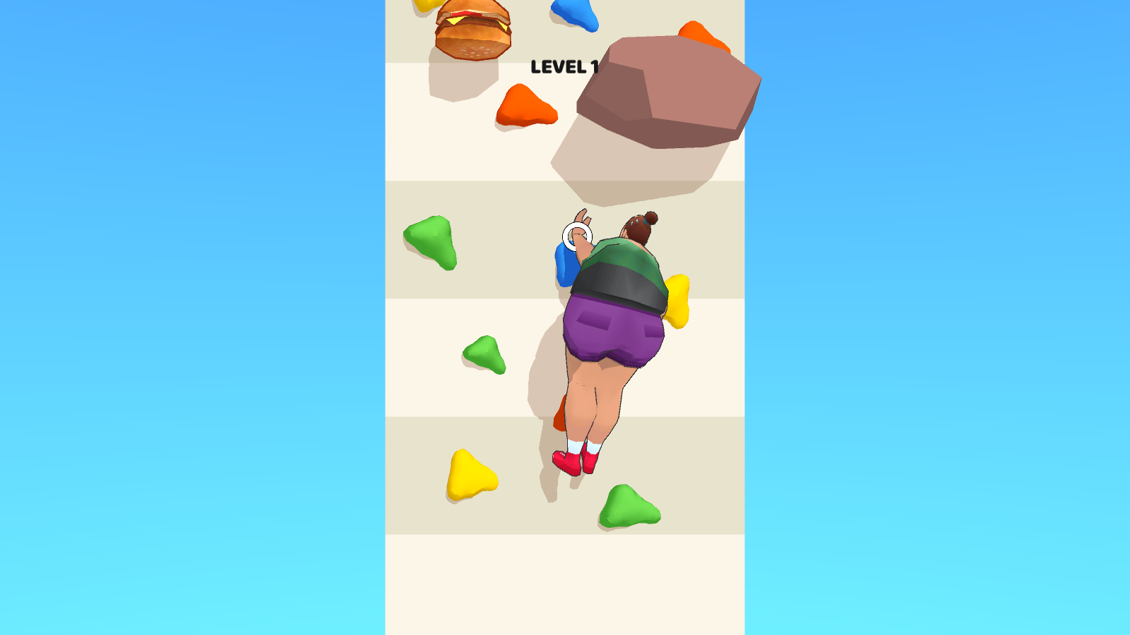 在攀岩中轻松操作自己的角色。每次攀岩都会消耗卡路里,让自己变瘦,从而达到减肥的目的和作用。