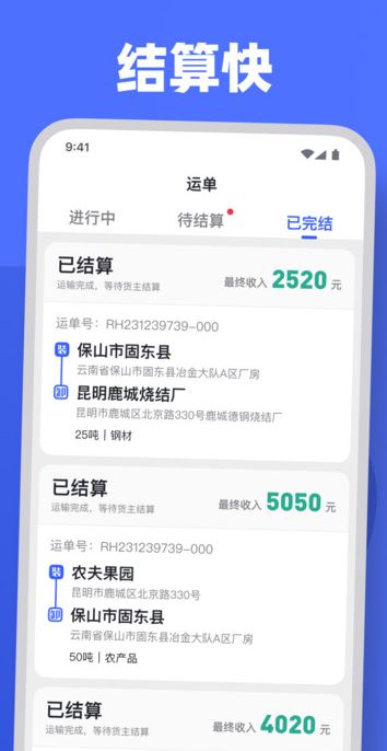 完善的收入管理系统让司机随时掌握收益情况,包括已完成订单金额、待结算金额和总收入等。订单详情可随时查询,包含运输路线、支付状态等完整信息。智能导航功能自动规划最优路线,实时更新路况,有效避开拥堵路段。