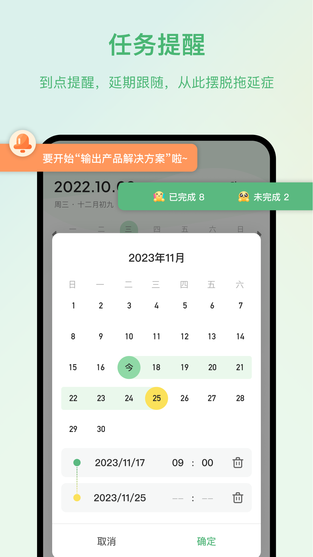 设置提醒:提醒你在截止日期前完成任务,避免拖延和遗漏,提高工作。